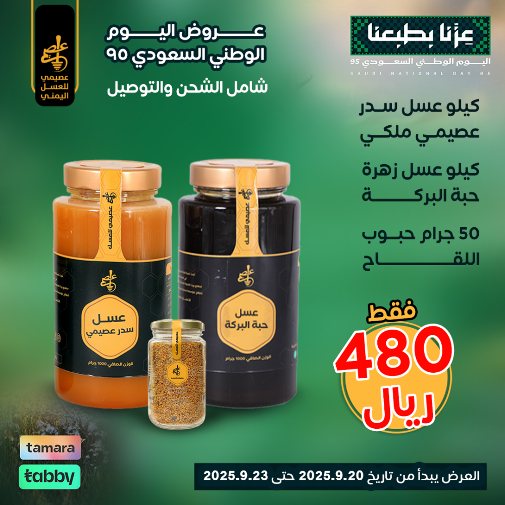 – عسل سدر عصيمي ملكي + عسل زهرة حبة البركة + حبوب اللقاح 🍯🌸بمناسبة اليوم الوطني السعودي 95 يقدم لكم متجر عسل السدر العصيمي عرضًا استثنائيًا يجمع بين أجود أنواع العسل الطبيعي الفاخر، مع توصيل مجاني وخيارات دفع مرنة عبر تمارا وتابي: